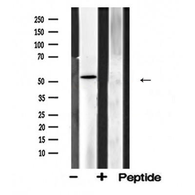 Western blot analysis of ADRA1A Antibody expression in mouse kidney tissue lysates.The lane on the right was treated with the antigen-specific peptide....