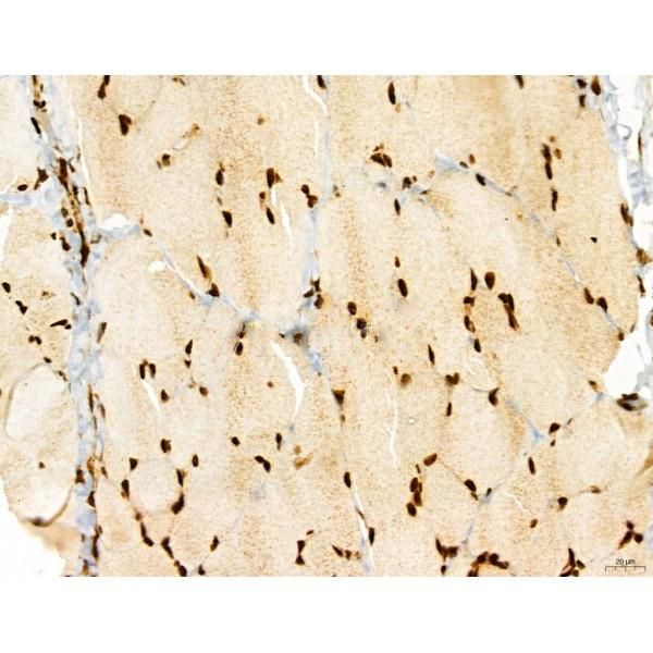 ab12763 at 1/100 staining Rat muscle tissue by IHC-P. The sample was formaldehyde fixed and a heat mediated antigen retrieval step in citrate buffer was performed. The sample was then blocked and incubated with the primary antibody at 4°C overnight. An HRP conjugated anti-Rabbit antibody was used as the secondary antibody....