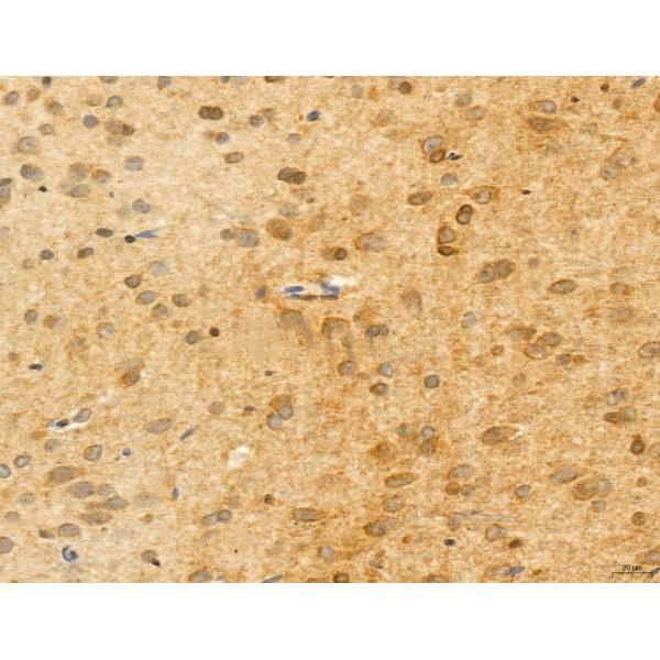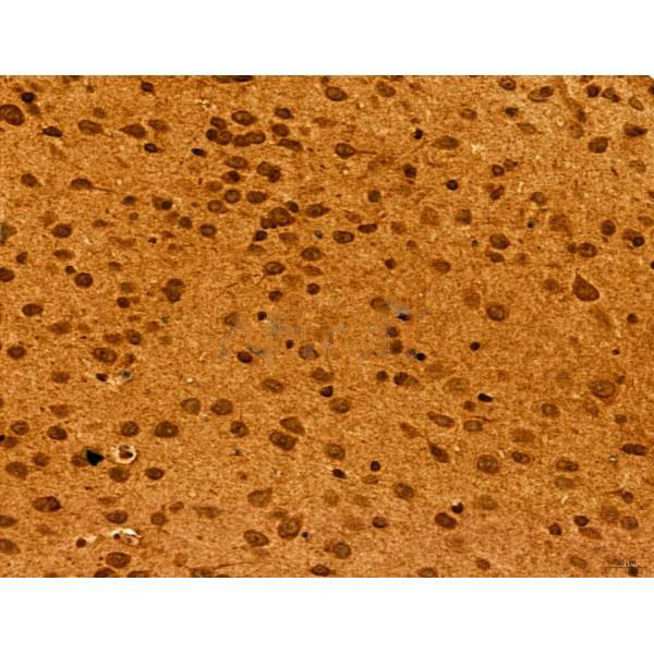 ab12763 at 1/100 staining Mouse brain tissue by IHC-P. The sample was formaldehyde fixed and a heat mediated antigen retrieval step in citrate buffer was performed. The sample was then blocked and incubated with the primary antibody at 4°C overnight. An HRP conjugated anti-Rabbit antibody was used as the secondary antibody....