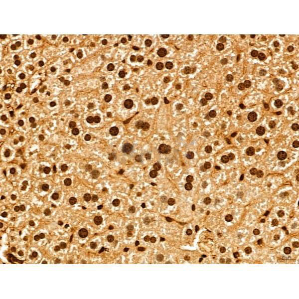 ab12763 at 1/100 staining Mouse liver tissue by IHC-P. The sample was formaldehyde fixed and a heat mediated antigen retrieval step in citrate buffer was performed. The sample was then blocked and incubated with the primary antibody at 4°C overnight. An HRP conjugated anti-Rabbit antibody was used as the secondary antibody....
