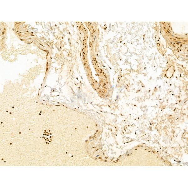 ab12763 at 1/100 staining Rat skin tissue by IHC-P. The sample was formaldehyde fixed and a heat mediated antigen retrieval step in citrate buffer was performed. The sample was then blocked and incubated with the primary antibody at 4°C overnight. An HRP conjugated anti-Rabbit antibody was used as the secondary antibody....