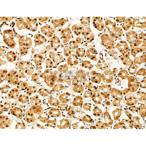 ab12763 at 1/100 staining Mouse stomach tissue by IHC-P. The sample was formaldehyde fixed and a heat mediated antigen retrieval step in citrate buffer was performed. The sample was then blocked and incubated with the primary antibody at 4°C overnight. An HRP conjugated anti-Rabbit antibody was used as the secondary antibody....