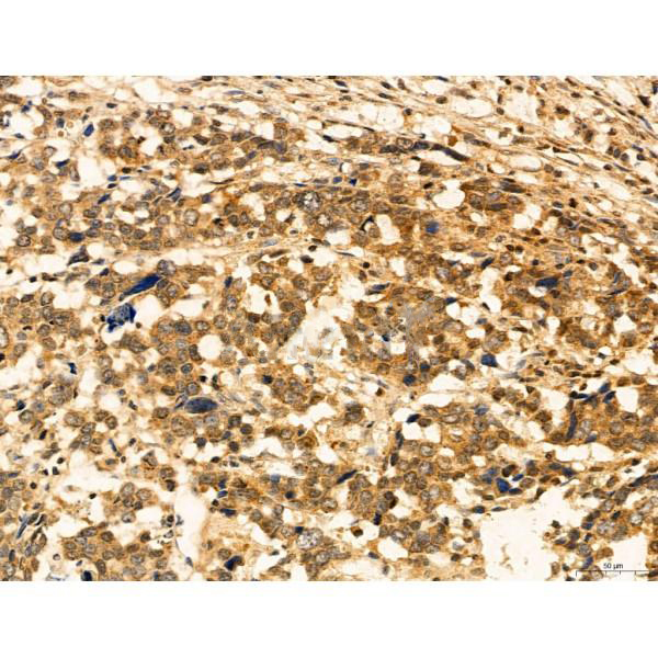 ab12763 at 1/100 staining Human gastric cancer by IHC-P. The sample was formaldehyde fixed and a heat mediated antigen retrieval step in citrate buffer was performed. The sample was then blocked and incubated with the primary antibody at 4°C overnight. An HRP conjugated anti-Rabbit antibody was used as the secondary antibody....