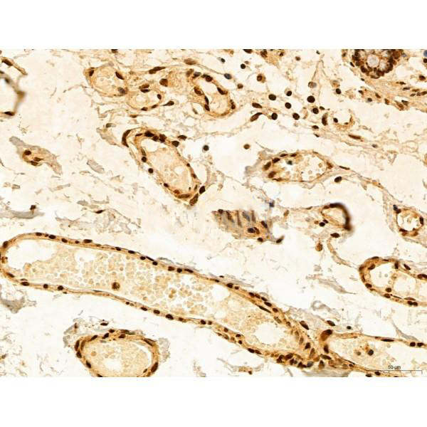ab12763 at 1/100 staining Human normal tissues adjacent to colorectal cancer by IHC-P. The sample was formaldehyde fixed and a heat mediated antigen retrieval step in citrate buffer was performed. The sample was then blocked and incubated with the primary antibody at 4°C overnight. An HRP conjugated anti-Rabbit antibody was used as the secondary antibody....
