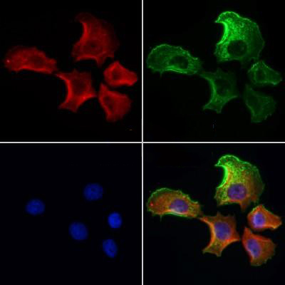 ab12763 staining Hela cells by IF/ICC. The samples were fixed with PFA and permeabilized in 0.1% Triton X-100,then blocked in 10% serum for 45 minutes at 25°C. Samples were then incubated with primary Ab(ab12763 1:200) and mouse anti-beta tubulin Ab(T0023 1:200) for 1 hour at 37°C. An AlexaFluor594 conjugated goat anti-rabbit IgG(H+L) Ab(Red) and an AlexaFluor488 conjugated goat anti-mouse IgG(H+L) Ab(Green) were used as the secondary antibody. The nuclear counter stain is DAPI(blue)....