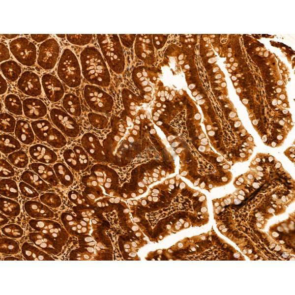 ab12763 at 1/100 staining Mouse colon tissue by IHC-P. The sample was formaldehyde fixed and a heat mediated antigen retrieval step in citrate buffer was performed. The sample was then blocked and incubated with the primary antibody at 4°C overnight. An HRP conjugated anti-Rabbit antibody was used as the secondary antibody....