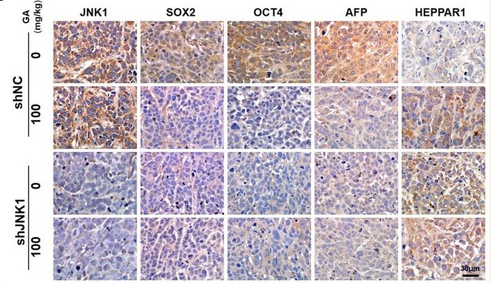 Figure 6 GA suppresses tumor growth and enhances the antitumor effect of sorafenib. Images of tumors (A), tumor volumes (B), and body weight (C) of PLC/PRF/5 transfected with shNC or shJNK1 in BALB/c nu/nu mice treated with 100 mg/kg GA or saline as control. (D) IHC staining indicates the expression of CSC markers (SOX2 and OCT4) and differentiation markers (AFP and HEPPAR1) in tumors. (E) IHC analysis of SOX2, OCT4, AFP, and HEPPAR1 in tumors (one-way ANOVA; ***P < 0.001). Scale bars in (D), 30 μm. Images of tumors (F), tumor volumes (G) and body weight (H) of PLC/PRF/5-bearing BALB/c nu/nu mice. GA or sorafenib treatment obviously inhibited tumor growth. Furthermore, GA could enhance the anti-tumor effect of sorafenib....