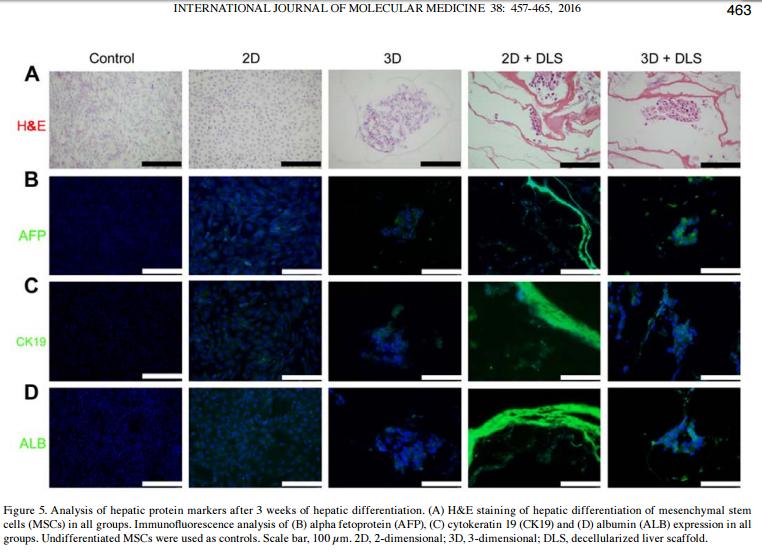 Figure 5. Analysis of hepatic protein markers after 3 weeks of hepatic differentiation. (A) H&E staining of hepatic differentiation of mesenchymal stem cells (MSCs) in all groups. Immunofluorescence analysis of (B) alpha fetoprotein (AFP), (C) cytokeratin 19 (CK19) and (D) albumin (ALB) expression in all groups. Undifferentiated MSCs were used as controls. Scale bar, 100 µm. 2D, 2-dimensional; 3D, 3-dimensional; DLS, decellularized liver scaffold....