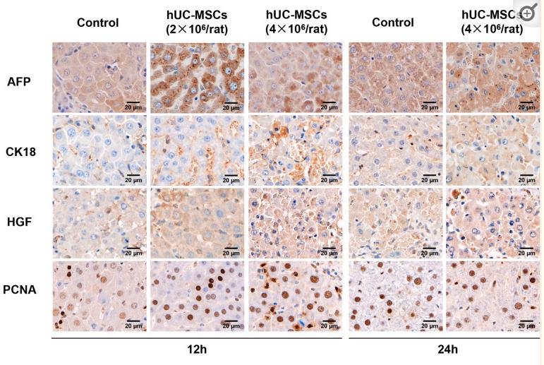 Fig. 7 The effects of hUC-MSC transplantation on hepatocyte regeneration in ACLF rats. Liver sections from ACLF rats 12 and 24 h post-hUC-MSC transplantation or 0.9% sodium chloride injection as a control were used for immunohistochemical staining of AFP, CK18, HGF, and PCNA and microscopic examination (n = 4/group). Representative photographs are shown (a). Positive staining was quantified and is presented as the mean ± SD (b, c). d Serum levels of HGF were detected by ELISA (4h, n = 3/group; 12h and 24h, n = 4/group). Data are presented as the mean ± SD. *P < 0.05, **P < 0.01, ***P < 0.001...