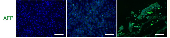 Figure 4. Analysis of hepatic protein markers in mouse MSCs following 23 days of hepatic differentiation. Green immunofluorescence staining of ALB, AFP and CK19 in undifferentiated MSC control, 2D and 3D groups. Nuclei were stained blue with DAPI. Scale bars, 100 µm. MSCs, mesenchymal stem cells; ALB, albumin; AFP, α-fetoprotein; CK19, cytokeratin-19....