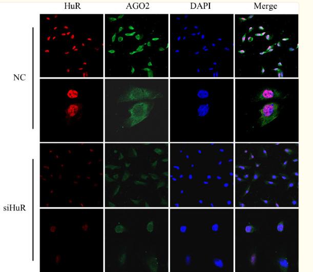 Figure 6 Confocal microscopic analysis of AGO2 expression in OS cells. Representative immunofluorescence analysis results for regulation of AGO2 by HuR and lncRNA XIST. SJSA-1 cells with different treatments were fixed with 1% paraformaldehyde and stained with anti-HuR (red) and anti-AGO2 (green) antibodies. Nuclei of cells appeared as blue because of DAPI nuclear staining. (A) Cells were transfected with an NC siRNA for 48 h. (B) Cells were transfected with a HuR siRNA for 48 h. (C) Cells were transfected with an lncRNA XIST siRNA for 48 h. (D) Cells were co-transfected with both HuR and lncRNA XIST siRNAs for 48 h. Stained cells were examined under a Leica confocal immunofluorescence microscope. Upper panel: original magnification 200x; lower panel, original magnification 630x....