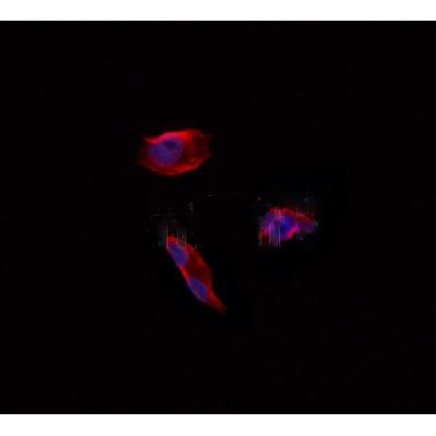 ab14499 staining Hela by IF/ICC. The sample were fixed with PFA and permeabilized in 0.1% Triton X-100,then blocked in 10% serum for 45 minutes at 25°C. The primary antibody was diluted at 1/200 and incubated with the sample for 1 hour at 37°C. An Alexa Fluor 594 conjugated goat anti-rabbit IgG (H+L) Ab, diluted at 1/600, was used as the secondary antibody....