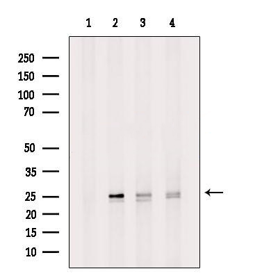 Western blot analysis of extracts from various samples, using AGR2 Antibody. Lane 1: Hybridoma cells, treated with blocking peptide; Lane 2: Hybridoma cells; Lane 3: Myeloma cells; Lane 4: Mouse liver. Observed bands: 23,25 kDa....