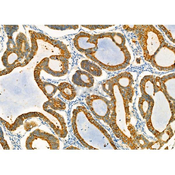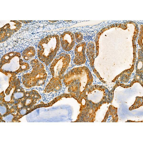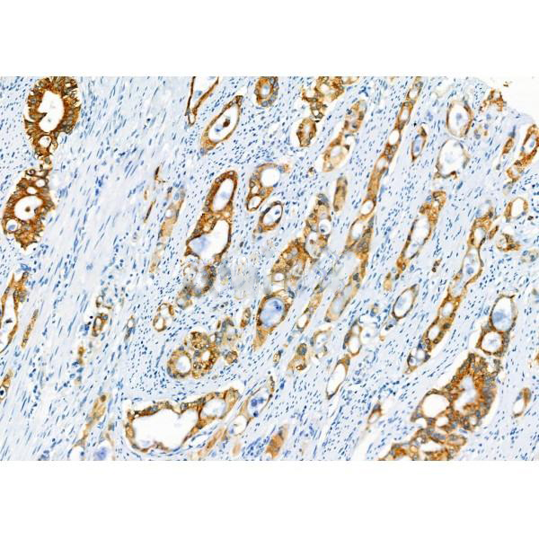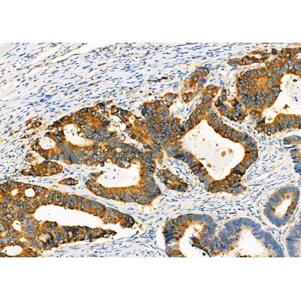ab17718 at 1/100 staining Human colorectal cancer by IHC-P. The sample was formaldehyde fixed and a heat mediated antigen retrieval step in citrate buffer was performed. The sample was then blocked and incubated with the primary antibody at 4°C overnight. An HRP conjugated anti-Rabbit antibody was used as the secondary antibody....