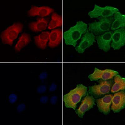 ab17718 staining Hela cells by IF/ICC. The samples were fixed with PFA and permeabilized in 0.1% Triton X-100,then blocked in 10% serum for 45 minutes at 25°C. Samples were then incubated with primary Ab(ab17718 1:200) and mouse anti-beta tubulin Ab(T0023 1:200) for 1 hour at 37°C. An AlexaFluor594 conjugated goat anti-rabbit IgG(H+L) Ab(Red) and an AlexaFluor488 conjugated goat anti-mouse IgG(H+L) Ab(Green) were used as the secondary antibody. The nuclear counter stain is DAPI(blue)....