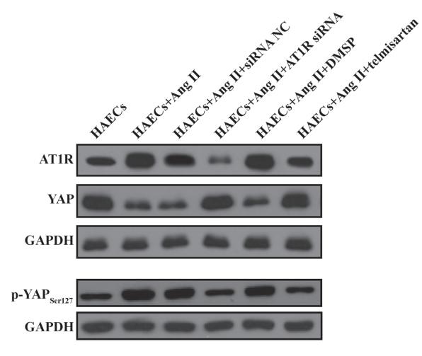 Figure 3. |Ang II promotes AT1R expression and YAP phosphorylation (Ser127), and treatment with telmisartan or transfection with AT1R siRNA reverses this effect. Grouping: Control group, HAECs only; group 1, HAECs with Ang II (1 µM) treatment; group 2, HAECs with Ang II (1 µM) and siRNA NC transfection; group 3, HAECs with Ang II (1 µM) and AT1R siRNA transfection; group 4, HAECs with Ang II (1 µM) and 1 µl DMSO; and group 5, HAECs with Ang II (1 µM) and the ARB 1 µl (20 mM) telmisartan treatment. (A) Western blot analysis of sets of six independent lysates from HAECs that were untreated, treated with Ang II, treated with Ang II and siRNA NC, treated with Ang II and AT1R siRNA, treated with Ang II and DMSO, or treated with Ang II and telmisartan. Treatment with Ang II upregulated AT1R and p‑YAP, and this effect was alleviated by transfection with an AT1R siRNA or treatment with telmisartan....