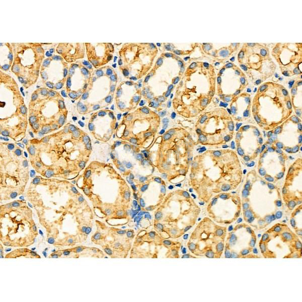 ab17295 at 1/100 staining Mouse kidney tissue by IHC-P. The sample was formaldehyde fixed and a heat mediated antigen retrieval step in citrate buffer was performed. The sample was then blocked and incubated with the primary antibody at 4°C overnight. An HRP conjugated anti-Rabbit antibody was used as the secondary antibody....
