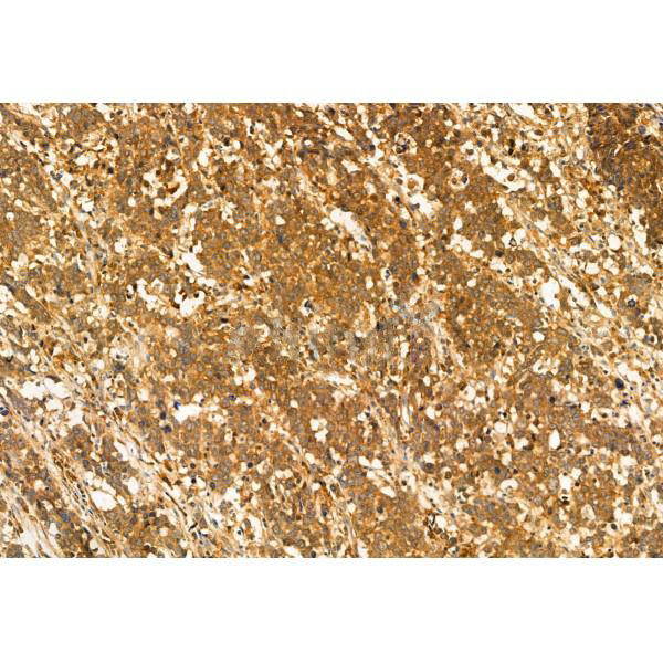 ab12712 at 1/100 staining Human gastric cancer by IHC-P. The sample was formaldehyde fixed and a heat mediated antigen retrieval step in citrate buffer was performed. The sample was then blocked and incubated with the primary antibody at 4°C overnight. An HRP conjugated anti-Rabbit antibody was used as the secondary antibody....
