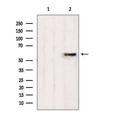 Western blot analysis of extracts from rat spleen, using AHCYL1 antibody. Lane 1 was treated with the blocking peptide....