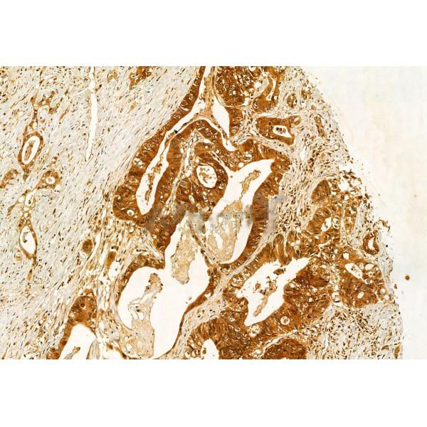 ab12712 at 1/100 staining Human colorectal cancer by IHC-P. The sample was formaldehyde fixed and a heat mediated antigen retrieval step in citrate buffer was performed. The sample was then blocked and incubated with the primary antibody at 4°C overnight. An HRP conjugated anti-Rabbit antibody was used as the secondary antibody....