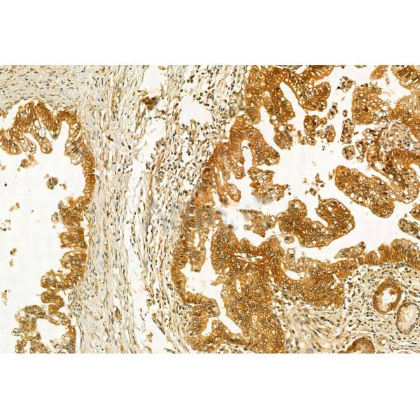 ab12712 at 1/100 staining Human pancreatic cancer by IHC-P. The sample was formaldehyde fixed and a heat mediated antigen retrieval step in citrate buffer was performed. The sample was then blocked and incubated with the primary antibody at 4°C overnight. An HRP conjugated anti-Rabbit antibody was used as the secondary antibody....