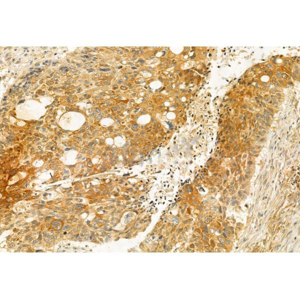 ab12712 at 1/100 staining Human lung cancer by IHC-P. The sample was formaldehyde fixed and a heat mediated antigen retrieval step in citrate buffer was performed. The sample was then blocked and incubated with the primary antibody at 4°C overnight. An HRP conjugated anti-Rabbit antibody was used as the secondary antibody....