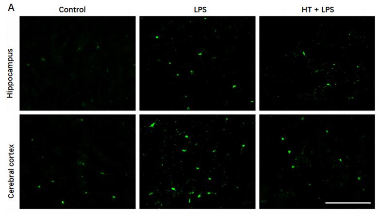 Fig11. |Effects of HT on microglia and astrocyte activation in LPS-challenged mouse brain. C57BL/6 mice were pretreated with HT (100 mg/kg) by gavage daily for 2 days, followed by injection with LPS (10 mg/kg) or PBS. 24 h after LPS or PBS injection, brain section (5 lm thick) were prepared and immunostaining for Iba-1 and GFAP were performed. Representative images of labeling for Iba-1 ((A), hippocampus and cerebral cortex) and GFAP ((C), hippocampus and corpus callosum) are presented, along with quantification results of Iba-1 (B) and GFAP (D)....