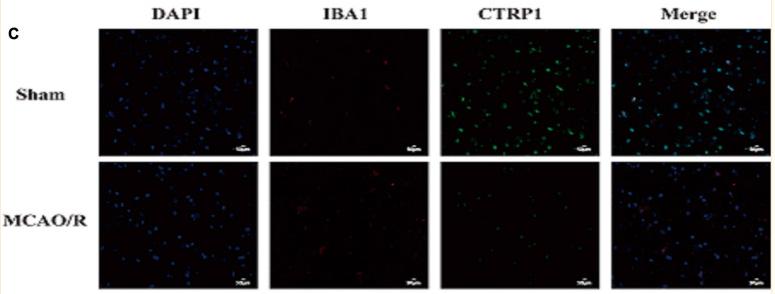 FIGURE 2 The location and expression of CTRP1 in the brain analyzed by immunofluorescence (n = 3). (A) The expression of CTRP1 in neuron in the cortex, NeuN was used to label neuron. CTRP1 expression was observed by fluorescence microscope and is shown by green fluorescence. NeuN expression is shown by red fluorescence. The nuclei were stained with DAPI and is shown by blue fluorescence. (B) The expression of CTRP1 in astroglia in the cortex. GFAP was used to label astroglia. CTRP1 expression is shown by red fluorescence. GFAP expression is shown by green fluorescence. (C) The expression of CTRP1 in microglia in the cortex. IBA1 was used to label microglia. CTRP1 expression is shown by green fluorescence. IBA1 expression is shown by red fluorescence. (D) The intensity of CTRP1 and NeuN in the cortex. The representative images were acquired under × 400 magnification, scale bars = 50 μm. ****p < 0.0001 vs. sham group....