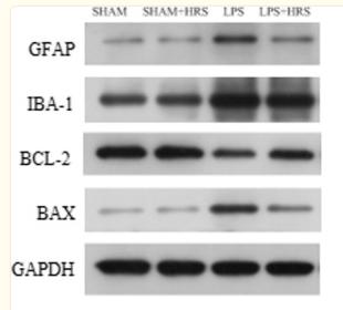 Fig. 8 Effects of HRS treatment on protein expressions in septic rats 48 h after LPS challenge. A Representative images of protein expression levels by western blot analysis in each group. B–E Statistical representation of relative protein expressions of GFAP, IBA-1, BCL-2 and BAX; respectively. All data are presented as mean ± SD ****p < 0.0001, ***p < 0.001, **p < 0.005, *p < 0.05. HRS Hydrogen-rich saline, LPS Lipopolysaccharide, GFAP Glial fibrillary acidic protein, IBA-1 Ionised calcium binding adaptor molecule 1, BCL-2 B-cell lymphoma 2...