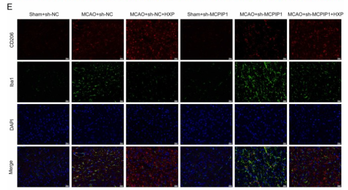 Fig. 3. HXP reduced neuroinflammation in MCAO rats by promoting MCPIP1-mediated microglia M2 polarization. A. After reperfusion for 7 d, brain water contents were examined. B. Brain infract volume was detected by 2,3,5-Triphentltetrazolium chloride staining. C. Changes in IL-1β, IL-6, iNOS, and TNF-α were measured via ELISA assy. D. Representative images of histopathological analysis. Scale bar, 20 µm. E. Representative immunofluorescence staining for CD206 (red) and Iba1 (green) in brain tissues. Scale bar, 20 µm. F. The expression of MCPIP1, CD16, iNOS, CD206, Arg1, and PPARγ was detected using Western blotting assay. Data are represented as mean ± standard deviation (N = 5). * * P ...