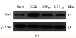 Figure 4 NBP suppressed the activation and regeneration of microglial cells after RCIR. (a) Representative images of double immunofluorescence labeling of Iba-1 (red) and BrdU (green) (200×) in CA1 regions of the hippocampus 4 weeks after RCIR. Iba1+/BrdU+ cells represented microglial proliferation. Bar = 50 μm. Typical double-labeled areas were magnified. n = 4 in each group. (b) The number of Iba-1+/BrdU+ cells in hippocampal CA1 regions. (c, d) Western blot and quantitative analysis of the expressions of Iba-1. n = 6 in each group. β-Actin was used as an internal control. ∗∗∗P < 0.001, the RCIR group vs. sham group; #P < 0.05, ###P < 0.001, the NBP80 group or the NBP120 group vs. the RCIR group; $P < 0.05, the NBP80 group vs. NBP120 group. Values are expressed as the mean ± SD. Iba-1: ionized calcium-binding adapter molecule....