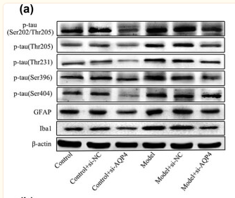 Figure 3 Effects of AQP4 on astrocytes, microglia, and neurodegeneration. (a) The expression of p-tau (Ser202/Thr205, Thr205, Thr231, Ser396, Ser404) and Iba1 in brain tissue was detected by Western blot. (b–e) GFAP, iba1 and GAP43 were detected by Immunofluorescence double staining and analyzed results were obtained (e). *p < 0.05 vs control, # p < 0.05 vs model. All experiments were repeated 3 times. Each group has 7 mice....