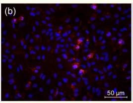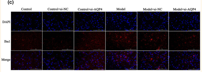 Figure 9 Identification of culture cells: (a) astrocytes in the primary culture: the cell bodies and processes are stained with GFAP antibody (red), the nuclei are stained with DAPI (blue), (b) microglia in the primary culture: cell bodies and processes are stained with Iba1 antibody (red), the nuclei are stained with DAPI (blue), (c) pericytes in the primary culture: the cell bodies and processes are stained with PDGFRB antibody (green), the nuclei are stained with DAPI (blue)....