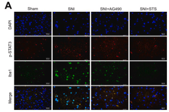 Fig. 6. Effects of STS on the protein expression of STAT3 and p-STAT3 in the ipsilateral dorsal horn of SNI rats and BV-2 cells. (A–B) Immunofluorescence staining showing that p-STAT3 (red) co-localized with microglia (Iba1, green) and astrocytes (GFAP, green); (C–E) Expression levels of STAT3 and p-STAT3 in BV-2 cells were detected by Western blot assay. All data were derived from the results of three independent experiments. Values are mean ± SEM (n = 3 per group), ***P < 0.001, **P < 0.01, *P < 0.05 (one-way ANOVA followed by Tukey...