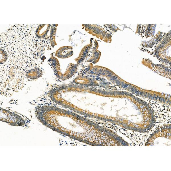 ab17073 at 1/100 staining Human colorectal cancer by IHC-P. The sample was formaldehyde fixed and a heat mediated antigen retrieval step in citrate buffer was performed. The sample was then blocked and incubated with the primary antibody at 4°C overnight. An HRP conjugated anti-Rabbit antibody was used as the secondary antibody....
