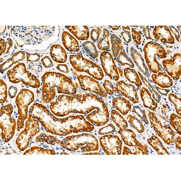 ab17073 at 1/100 staining Human kidney cancer and adjacent normal tissues by IHC-P. The sample was formaldehyde fixed and a heat mediated antigen retrieval step in citrate buffer was performed. The sample was then blocked and incubated with the primary antibody at 4°C overnight. An HRP conjugated anti-Rabbit antibody was used as the secondary antibody....