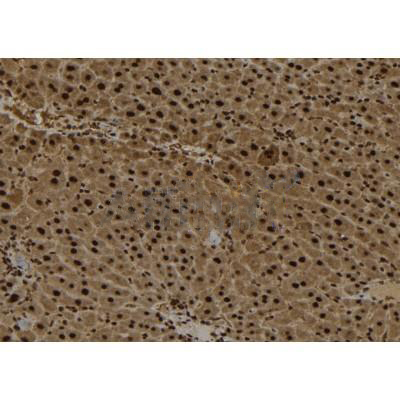 ab12669 at 1/100 staining Mouse liver tissue by IHC-P. The sample was formaldehyde fixed and a heat mediated antigen retrieval step in citrate buffer was performed. The sample was then blocked and incubated with the antibody for 1.5 hours at 22°C. An HRP conjugated goat anti-rabbit antibody was used as the secondary antibody....