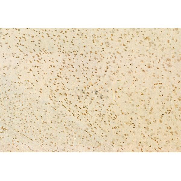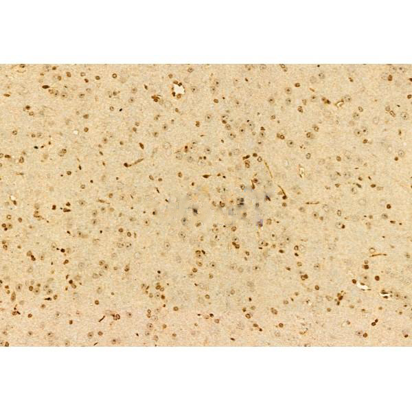 ab12669 at 1/100 staining Mouse brain tissue by IHC-P. The sample was formaldehyde fixed and a heat mediated antigen retrieval step in citrate buffer was performed. The sample was then blocked and incubated with the primary antibody at 4°C overnight. An HRP conjugated anti-Rabbit antibody was used as the secondary antibody....