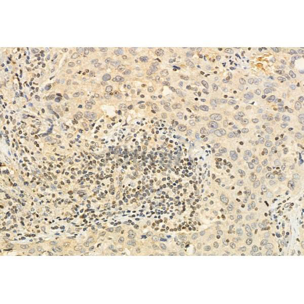 ab12669 at 1/100 staining Human lung cancer by IHC-P. The sample was formaldehyde fixed and a heat mediated antigen retrieval step in citrate buffer was performed. The sample was then blocked and incubated with the primary antibody at 4°C overnight. An HRP conjugated anti-Rabbit antibody was used as the secondary antibody....