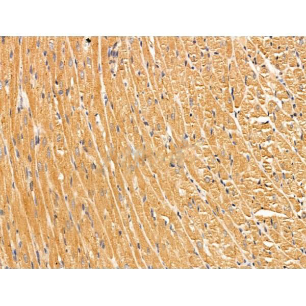ab10245 at 1/100 staining Rat heart tissue by IHC-P. The sample was formaldehyde fixed and a heat mediated antigen retrieval step in citrate buffer was performed. The sample was then blocked and incubated with the primary antibody at 4°C overnight. An HRP conjugated anti-Rabbit antibody was used as the secondary antibody....