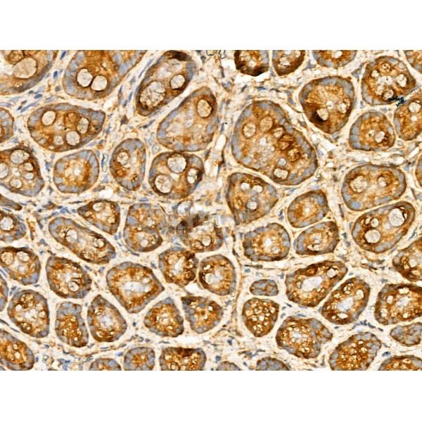 ab10245 at 1/100 staining Rat stomach tissue by IHC-P. The sample was formaldehyde fixed and a heat mediated antigen retrieval step in citrate buffer was performed. The sample was then blocked and incubated with the primary antibody at 4°C overnight. An HRP conjugated anti-Rabbit antibody was used as the secondary antibody....