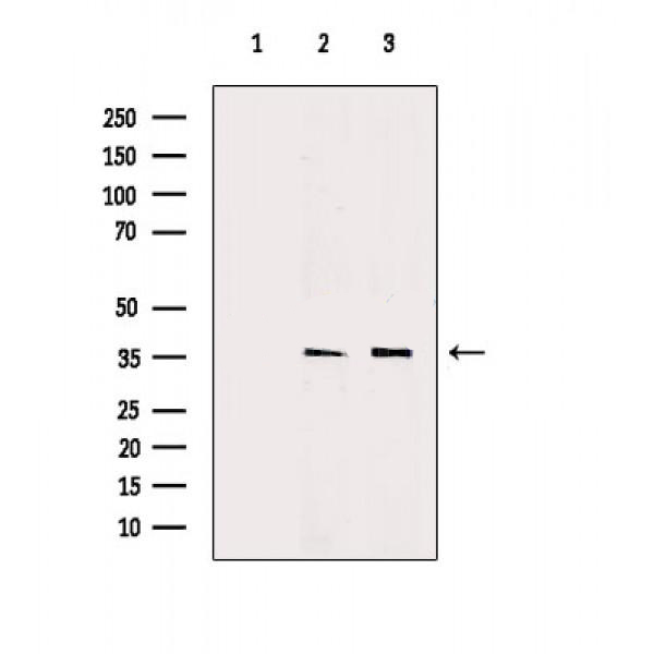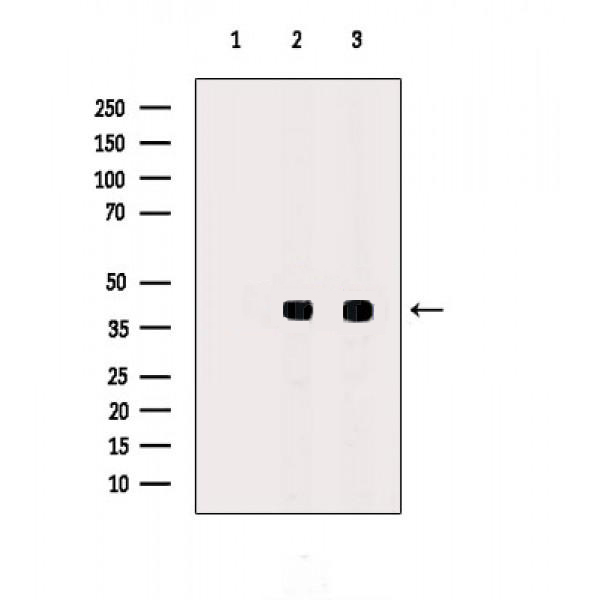 Western blot analysis of extracts from various samples, using AKR1C3 Antibody. Lane 1: Hela cells(H2O2 treatment), blocked with antigen-specific peptides, Lane 2: Hela cells(H2O2 treatment), Lane 3: A549 cells....