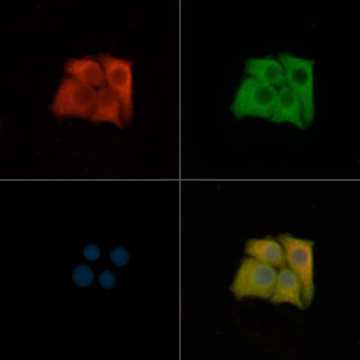 ab16670 staining A549 cells by IF/ICC. The samples were fixed with PFA and permeabilized in 0.1% Triton X-100,then blocked in 10% serum for 45 minutes at 25°C. Samples were then incubated with primary Ab(ab16670) and mouse anti-beta tubulin Ab(T0023) for 1 hour at 37°C. An AlexaFluor594 conjugated goat anti-rabbit IgG(H+L) Ab(Red) and an AlexaFluor488 conjugated goat anti-mouse IgG(H+L) Ab(Green) were used as the secondary antibody. The nuclear counter stain is DAPI (blue)....