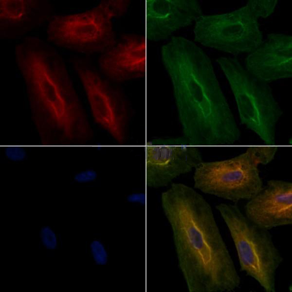 ab16670 staining Hela cells by IF/ICC. The samples were fixed with PFA and permeabilized in 0.1% Triton X-100, then blocked in 10% serum for 45 minutes at 25°C. Samples were then incubated with primary Ab(#ab16670) and mouse anti-beta tubulin Ab(#T0023) for 1 hour at 37°C. An AlexaFluor594 conjugated goat anti-rabbit IgG Ab(Red) and an AlexaFluor488 conjugated goat anti-mouse IgG Ab(Green) were used as the secondary antibody. The nuclear counter stain is DAPI (blue)....