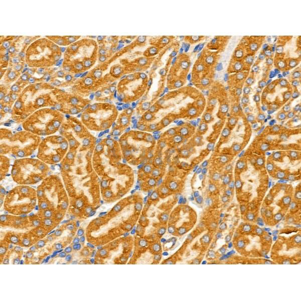ab14617 at 1/100 staining Mouse kidney tissue by IHC-P. The sample was formaldehyde fixed and a heat mediated antigen retrieval step in citrate buffer was performed. The sample was then blocked and incubated with the primary antibody at 4°C overnight. An HRP conjugated anti-Rabbit antibody was used as the secondary antibody....