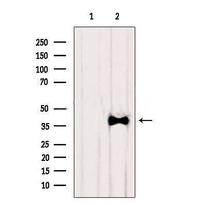 Western blot analysis of extracts from Mouse liver, using AKR7A2 Antibody. The lane on the left was treated with blocking peptide....