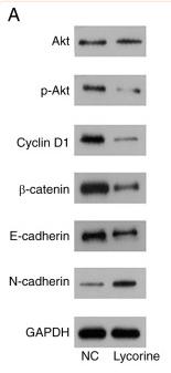 Figure 3 Lycorine changes the activation level of the Akt signaling pathway via RBM10. (A-C) Lycorine significantly decreased the activation level of the Akt signaling pathway. (D) Lycorine significantly increased the protein expression levels of E-cadherin and significantly reduced the protein expression levels of E-cadherin. (E-G) Despite the presence of lycorine, the inhibition of RBM10 significantly increased the activation level of the Akt signaling pathway. (H) Decreasing RBM10 expression induced a significant increase in N-cadherin protein expression. *P<0.05 and **P<0.01. RBM10, RNA binding motif 10; NC, negative control; p, phosphorylated; siRNA, small interfering RNA....