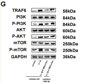 Fig. 7 Enriched miR-146b-5p in F-MSCs-Exo inhibits PI3K/AKT/mTOR pathway by targeting TRAF6. (A, B) Western blot analysis was performed to detect the impact of F-MSCs-Exo on TRAF6 and the PI3K/AKT/mTOR pathway in rat chondrocytes. (C, D) The expression of TRAF6 was quantitatively analyzed using immunofluorescence staining and ImageJ software (scale bar = 10 μm). (E, F) Direct visualization of chondrocytes treated with nc-inhibitor and miR-146b-5p-inhibitor was performed using Alcian blue staining and safranin staining. (G, H) Western blot analysis was conducted to examine the expressions of TRAF6 and the PI3K/AKT/mTOR pathway in chondrocytes after treatment with nc-inhibitor and miR-146b-5p-inhibitor. (ns, no significant difference; *p...