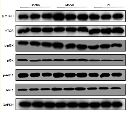 Figure 8 PF downregulated the protein expression levels of p-AKT1/AKT1, Bcl-2, EGFR, p-mTOR/mTOR, and p-PI3K/PI3K in the colonic mucosa from the dextran sodium sulfate-induced mice. Data are presented as the mean ± SD. *P...