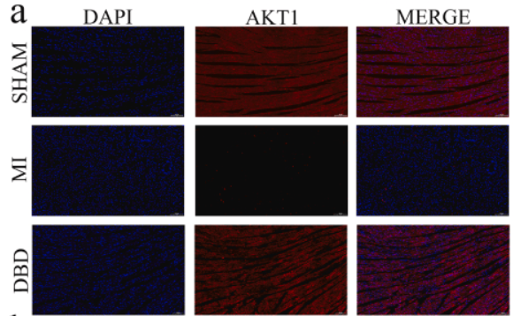 Fig. 8 The expression of core proteins AKT1, ERK2, and CASPASE-9. (A) Relative protein expression levels of AKT1 (a), ERK2 (b), and CASPASE-9 (c) treated with DBD in the MI rat model. Data are presented as the mean ± SD (n = 3). *P < 0.05 and **P < 0.01 versus the sham group; #P < 0.05 and ##P < 0.01 versus the MI group. (B) Immunofluorescence staining to detect the effect of DBD treatment on core proteins expression (original magnifications: 100 × ). (a–c) The expression of AKT1, ERK2, and CASPASE-9. Data are presented as the mean ± SD (n = 3). **P < 0.01 versus the sham group; ##P < 0.01 versus the MI group....